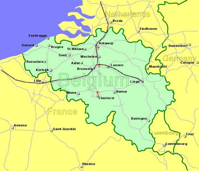 Aeropuertos en Bélgica mapa. Bélgica aeropuertos mapa (Europa Occidental - Europa) para imprimir. Bélgica aeropuertos mapa (Europa Occidental - Europa) para descargar. Según el CIA World Factbook 2009, hay un total de 43 aeropuertos en Bélgica, 27 de los cuales tienen pistas pavimentadas, como se muestra en el mapa de aeropuertos de Bélgica. Los pasajeros de avión en Bélgica pueden utilizar 5 aeropuertos, el mayor de los cuales es el Aeropuerto de Bruselas. Los otros aeropuertos son el Aeropuerto Internacional de Ostende-Bruges, el Aeropuerto de Bruselas-Sur de Charleroi, el Aeropuerto de Lieja y el Aeropuerto Internacional de Amberes. Otros aeropuertos son militares o pequeños aeropuertos civiles sin vuelos regulares. Los aeropuertos militares más conocidos son la Base Aérea de Melsbroek y la Base Aérea de Beauvechain
